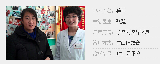 程菲在电视上看到了沈阳曙光医院的广告。抱着试一试的心态,来到沈阳曙光医院找到了张慧主任。检查发现程菲患的其实是子宫内膜异位症。于是安排了宫腹腔镜手术+药物调理,三个月后程菲顺利怀孕了,特给主任报喜。(查看更多相似病例,请点击这里)